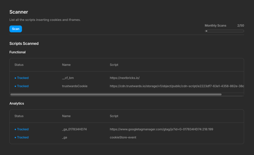 The Scanner is one of Trustwards' core features. It automatically analyzes your website to detect all cookies and iframes in use, saving you hours of manual research and ensuring your consent management accurately reflects your site's data collection practices.